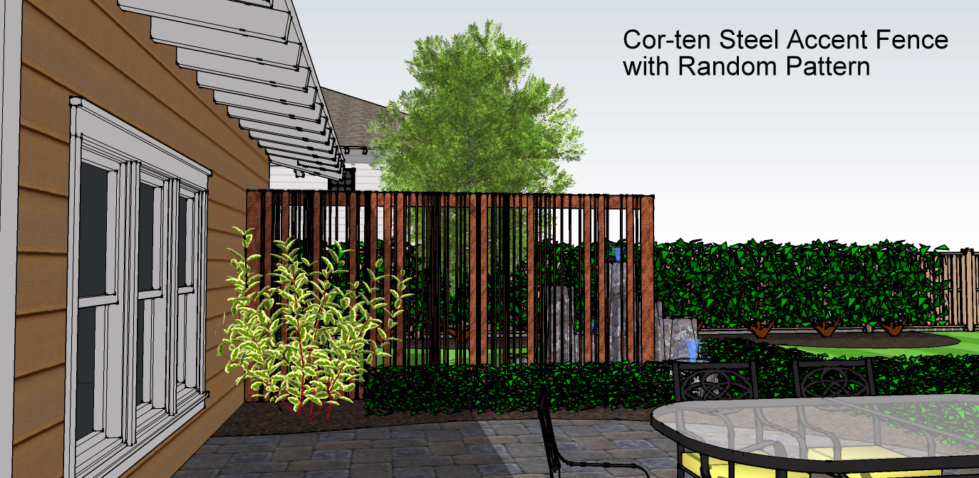 • Instead of using the gabion walls from concept #3, Ipe accent fencing was designed in. The Ipe hardwood will tie in the Ipe built-in bench and the Ipe outdoor kitchen surround.